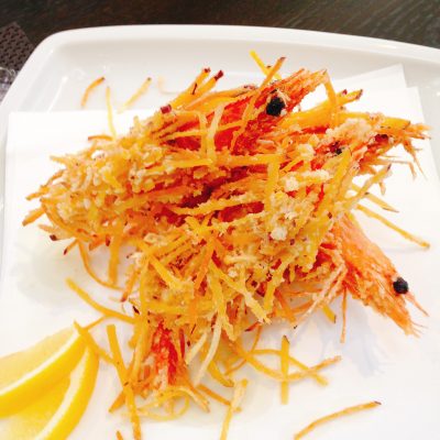 お店からの1品は「大海老の薩摩芋揚げ」 お店でも女性に大人気の揚げものです。衣は季節ごとに変わるのですが特に薩摩芋が人気ですね。レモンをキュっとしぼってパリパリした衣と甘い海老をお楽しみください。